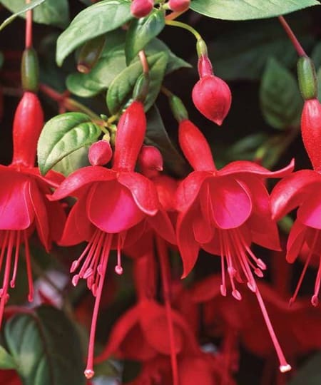 Notes: The scarlet sepals and deep red petals of Fuchsia 'Marinka' make a bold colour combination. This free flowering trailing fuchsia has cascading stems that drip with flowers throughout the summer. Perfect for brightening up hanging baskets and containers whether you grow them on their own or as part of a mixed display. Height: 30cm (12). Spread: 45cm (18).