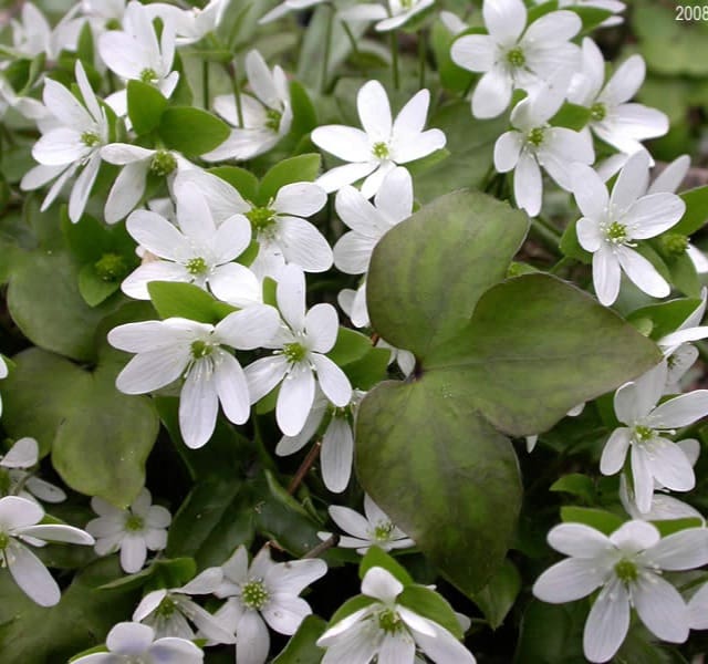 Notes: The first spring flowers in the forest. Blooms can be pink, blue or white. Distinctive mottled green leaves which turn red in the fall which persist throughout the winter and mark their spot in the spring.