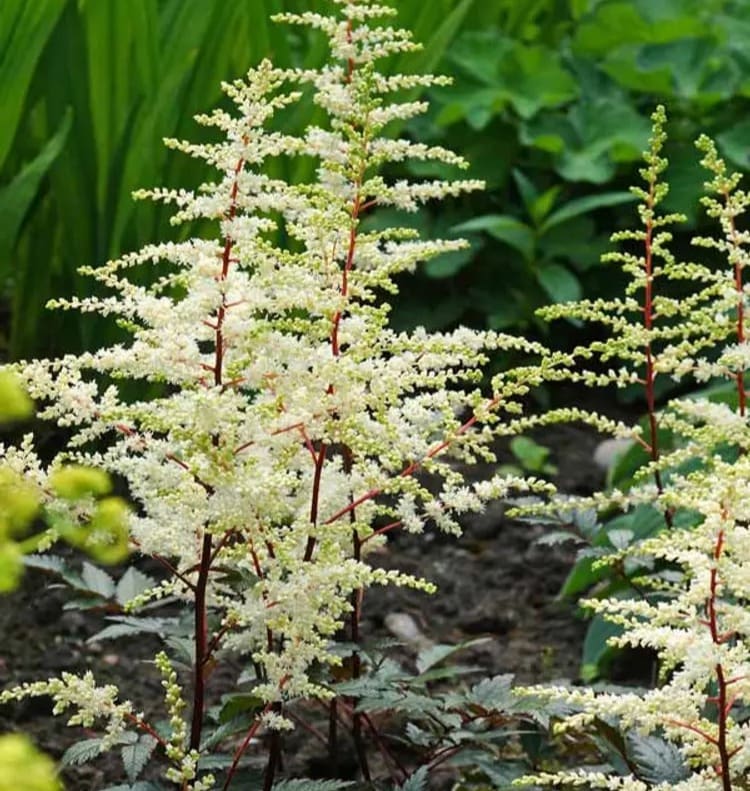 Notes: Froths of white blossoms float above dark bronze foliage. Thick plumes on red stems cover the glossy bronze foliage that transitions to dark green after flowering. Astilbe are mainstays of shade and woodland gardens.