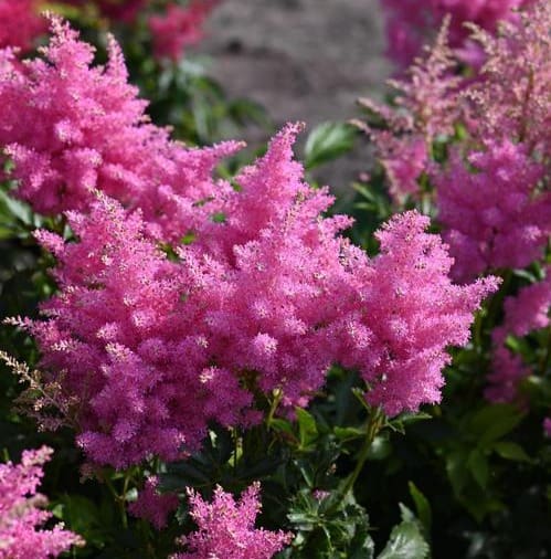 Notes: Mid-season bloomer, a dense carpet of dark green foliage surrounds feathery plumes of fragrant, bright rose-pink flowers, very floriferous. Compact, semi-dwarf habit makes it suitable for containers.