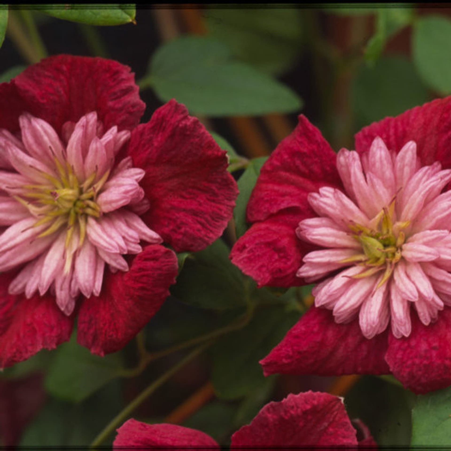 Notes: A very unusual 3” red flower with pink petaloid stamens giving the impression of a double flower and protruding trumpet. Masses of flowers over a long period. Resistant to clematis wilt. Extremely winter hardy. Blooms July to Spetember. Part of the ‘Festoon Collection’. Pruning technique #3.