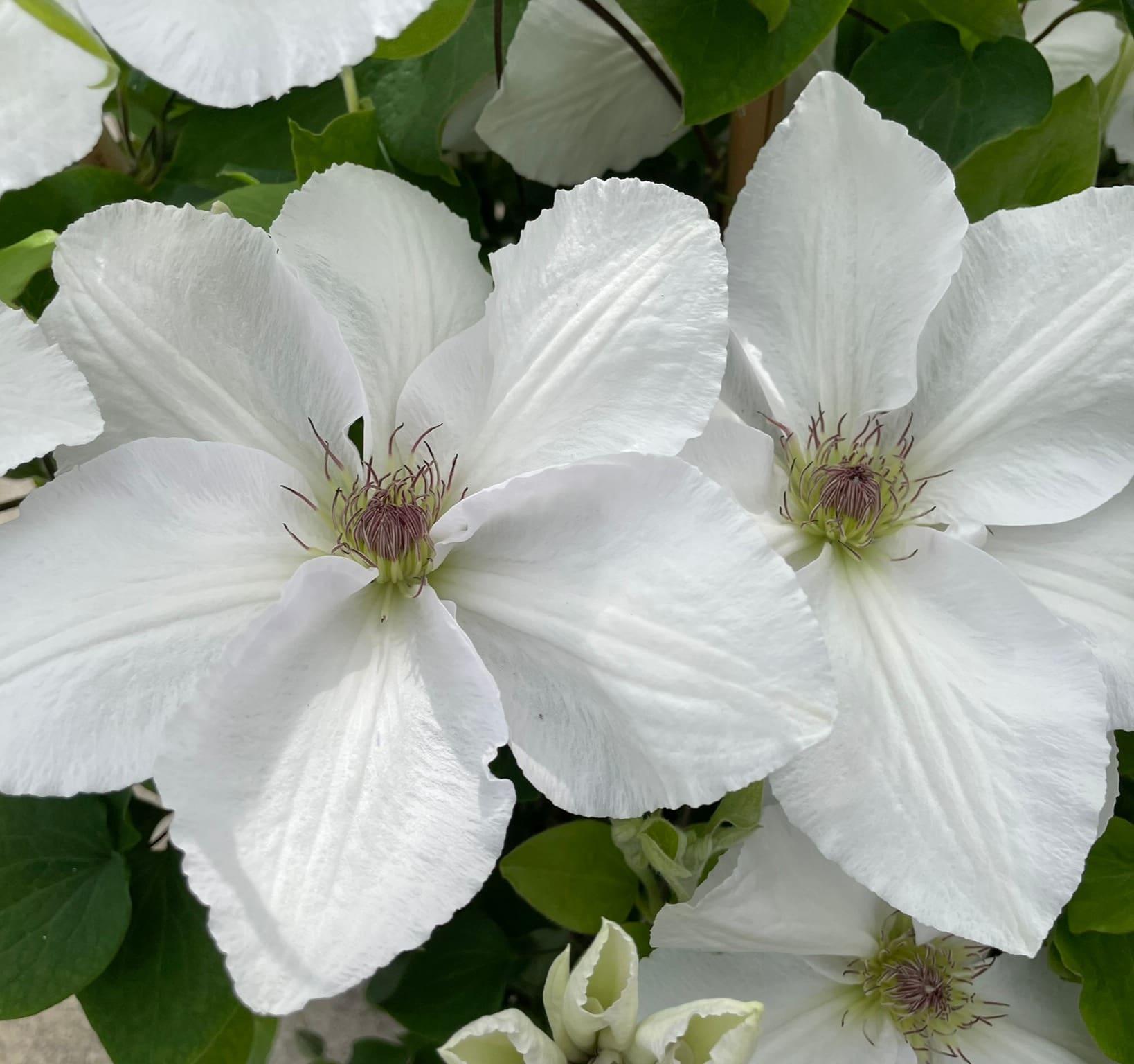 Notes: Exquisite large star-shaped pure white flowers with red anthers. Guernsey Flute is a wonderful addition to a patio or in the mid to front of the a flower order where its longevity of successive flowers can be fully appreciated. This exceptional clematis has an unusual but endearing trait of holding just open flower buds for an extended period, almost like a champagne flute. Best grown in partial shade.