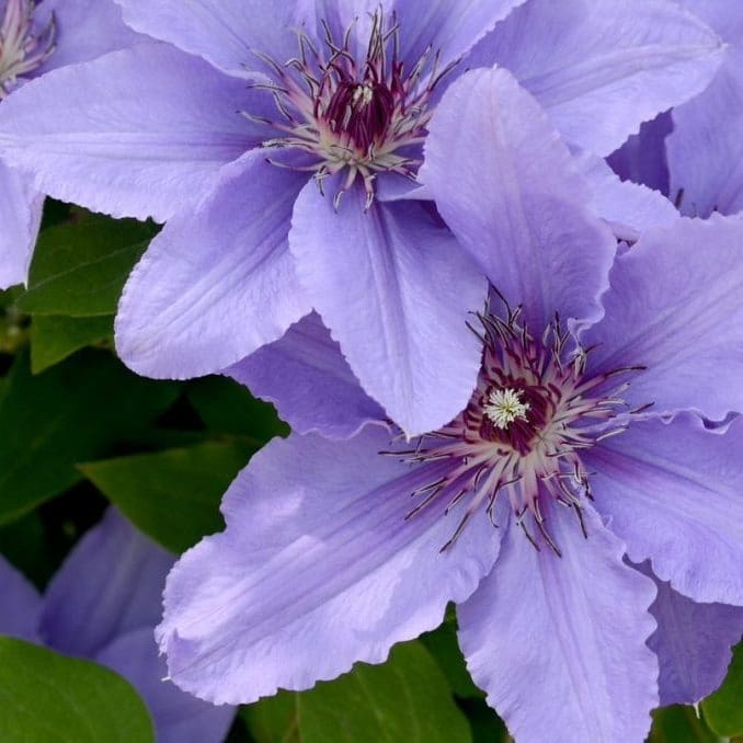 Notes: A superb repeat blooming clematis that performs so well year after year. Compact, free flowering produces an abundance of pale violet flowers that are 4″ across with wavy-edged petals and attractive red anthers. Bloom time early summer to late autumn. Grows to 4ft.