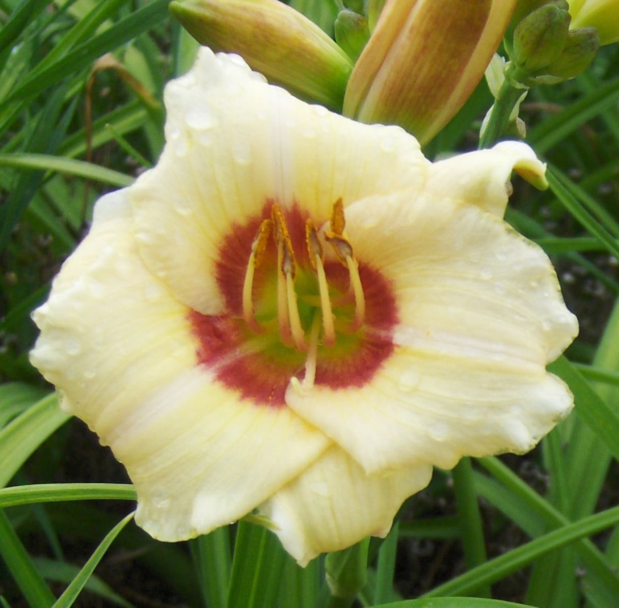 Notes: Early-midsummer brings 4" creamy white ruffled blossoms with a prominent cranberry-purple eye; fragrant flowers are very sunfast. A vigorous grower and reblooms; great for the landscape. Award Winner.