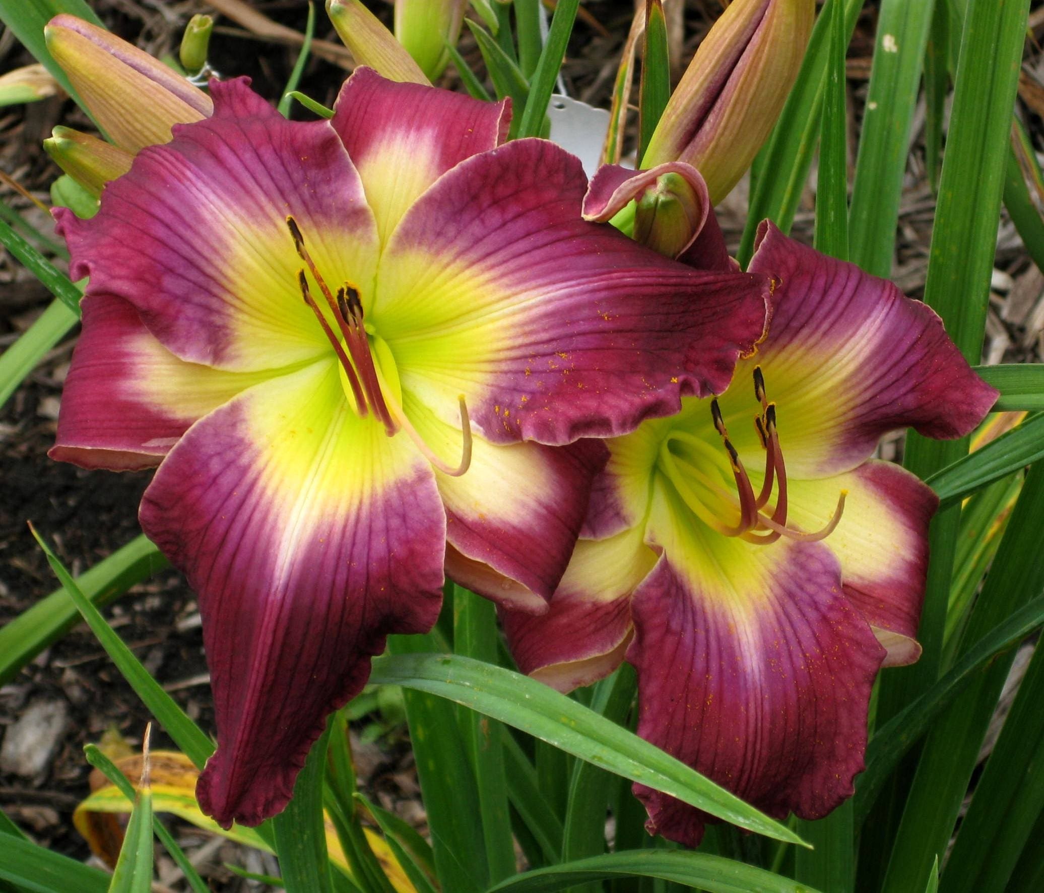 Notes: Midseason, 6" dark burgundy-purple flowers with a triangular pale cream eye and yellow throat, reblooms, tetraploid.