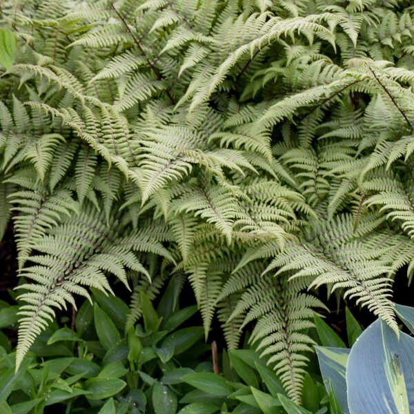 Notes: A sterile hybrid cross between Japanese Painted Fern and Southern Lady Fern with stunning silvery fronds that grow broad and tall. Rigid upright clump form is bound to leave you with a haunting impression. 24-36 inches.