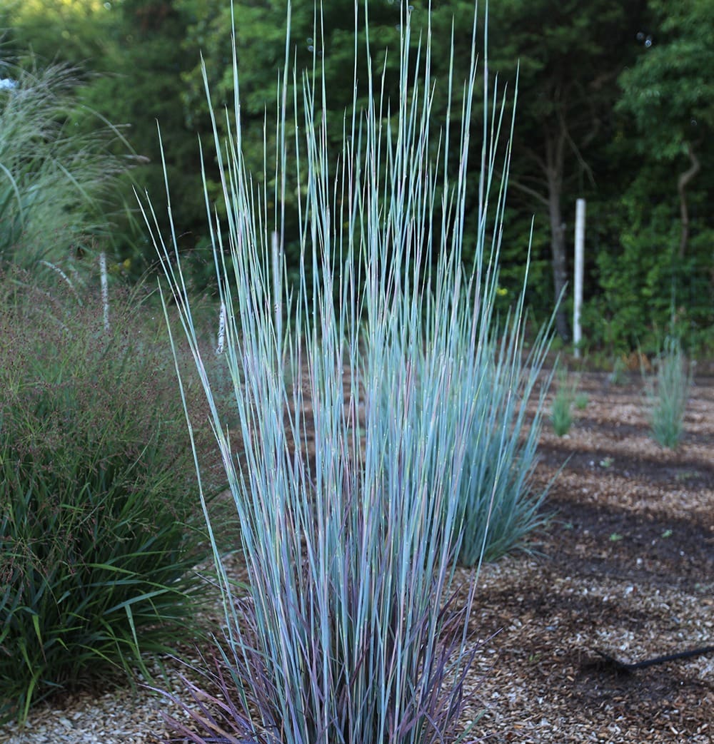 Notes: So distinctive that it’s easy to pick out among dozens of Schizachyrium cultivars in breeder Hortech, Inc.’s trials. Uniquely narrow habit; forms a strictly upright clump of sky blue, finely textured foliage. Beginning in late summer, the entire clump flushes ruby red and purple from the base. An architecturally interesting native cultivar for hedges or accents.