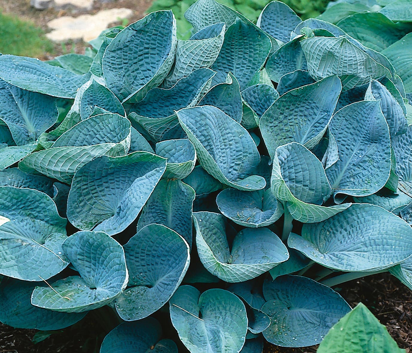 Notes: Large, round & very puckered cup-shaped deep blue leaves; Heavy substance and pest resistant. Very floriferous with white flowers on 30-36” scapes in late June. Medium to slow growth rate. 24-28 inches tall by 36 inches wide. One of the best big blue Hosta sieboldiana type cultivars.