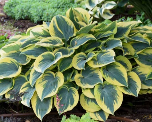 Notes: Intense blue-green leaf. Emerges with a gold margin which changes to pure white later in the season. Light lavender flowers. 16” tall by 36” wide. 28 inch scapes.