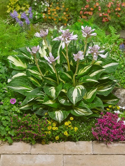 Notes: Deep green margins are amazingly wide and gently hug a narrow, flame-like, white center. Good leaf substance and growth rate. Forms a showy mound. Lavender flowers. 12-15”h x 30” w. Zone 3-8.