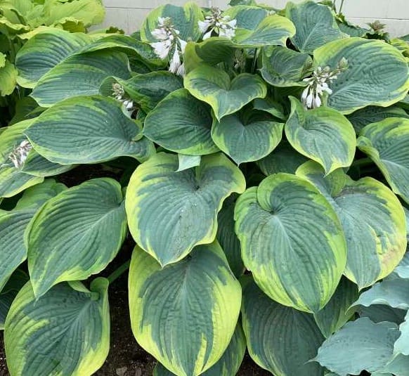 Notes: Giant. Beautiful blue hosta with a non-burning yellow margin. Blue-green, moderately corrugated leaves have smooth margins. White flowers. 29"h x 66" w.
