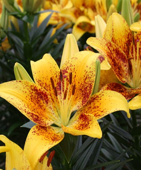 Notes: Bright yellow with maroon speckled centers. Strong grower with excellent foliage and improved flower form. 3-6 buds per stem. 12-14 inches.