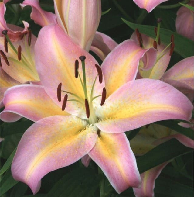 Notes: Showy large fragrant flowers, soft pink with yellow midrim and dark orange stamens. Delicious fragrance.