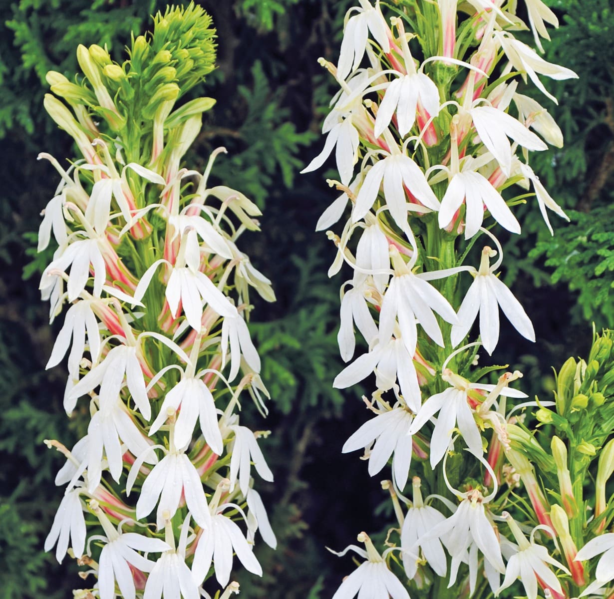 Notes: Nearly identical to the native red Lobelia cardinalis but in a stark white. Clumps of foliage stay tight to the ground until ready to bloom when it throws up tall spikes of vivid white flowers. Tolerates wet conditions with ease. Deer and rabbit resistant.