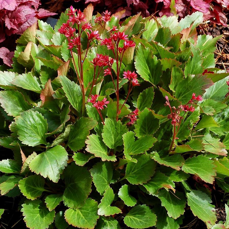 Notes: A cool and lovely intergeneric cross: Hybrid of Bergenia and Mukdenia. Dark pink flowers from the Bergenia and shiny thick, leathery foliage with jagged burgundy edges, Blooms early spring to summer with interesting fall color.