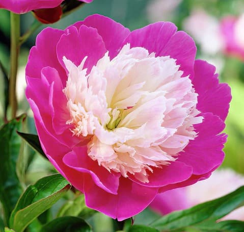 Notes: Peony Santa Fe stands out in the field for it’s wonderful color combination of dark pink guard petals surrounding a light pink to white center. The color does not fade as the blooms open and age so it remains striking through the bloom. Very stiff stems do not need staking. You’ll love this showy variety, not often found for sale.