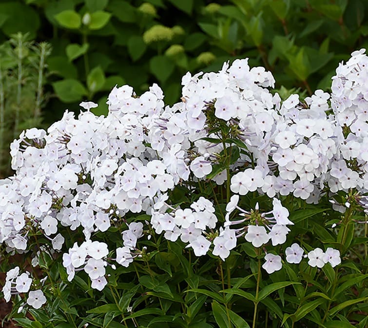 Notes: This type of Hybrid Phlox blooms earlier than the average Tall Garden Phlox (P. paniculata), starting about 2-3 weeks earlier than the typical Phlox. Each member of the Fashionably Early series has exceptional mildew resistance, thick leathery leaves, and a stoloniferous habit (as opposed to the tightly clumping P. paniculata types). ‘Fashionably Early Crystal’ is a taller variety of Hybrid Phlox that will work best for the middle to back of the border. In addition to being early blooming, it boasts a long season of color. Pure white flowers with a faint light purple eye appear from early summer well into midsummer with some rebloom in fall. Broad, dark green, thick foliage stays beautiful all season.