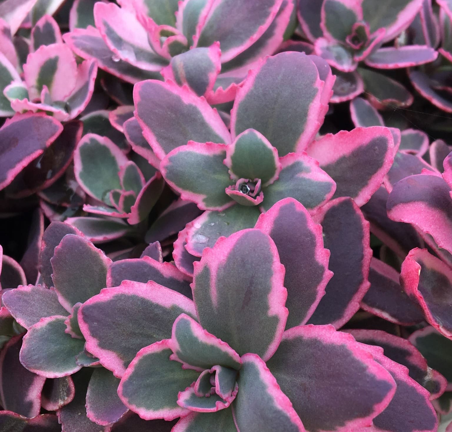 Notes: A sport of Plum Dazzled. Colorful tri-colored leaves emerge in spring with a collage of pink, white & purple. In full summer sun centers turn dark purple with hot pink edges. Magenta-pink flowers in fall. 15"h x 16-18". Cut. Zone 4-9.