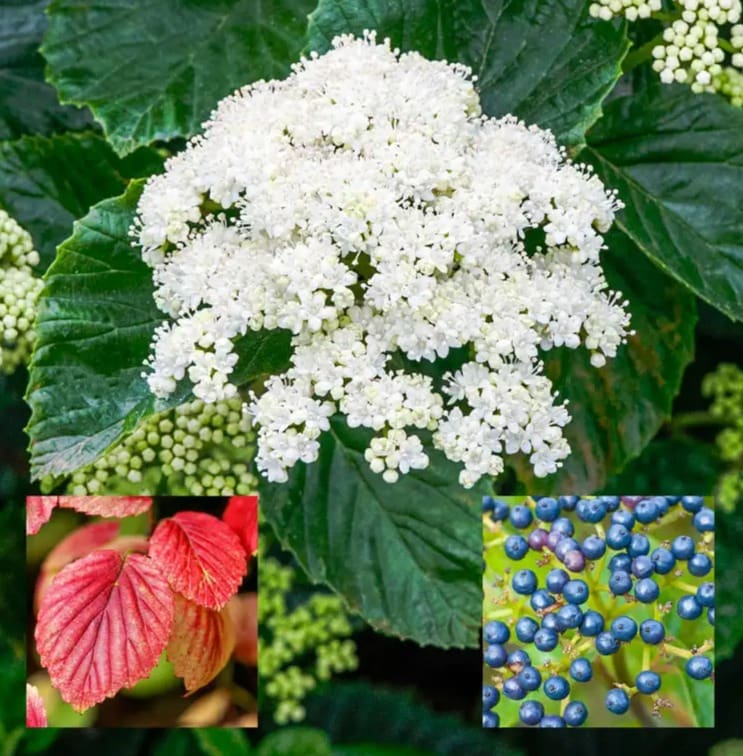 Notes: A clonal selection of Viburnum dentatum with excellent shape and form. Blooms in late May to mid-June with creamy white flowers, followed by clusters of blue-black fruit from late August through early October. Fall color can be a range of colors from yellow, orange and red to burgundy in late fall. Pollinators flock to this shrub! Use as a pollinator for Blue Muffin.